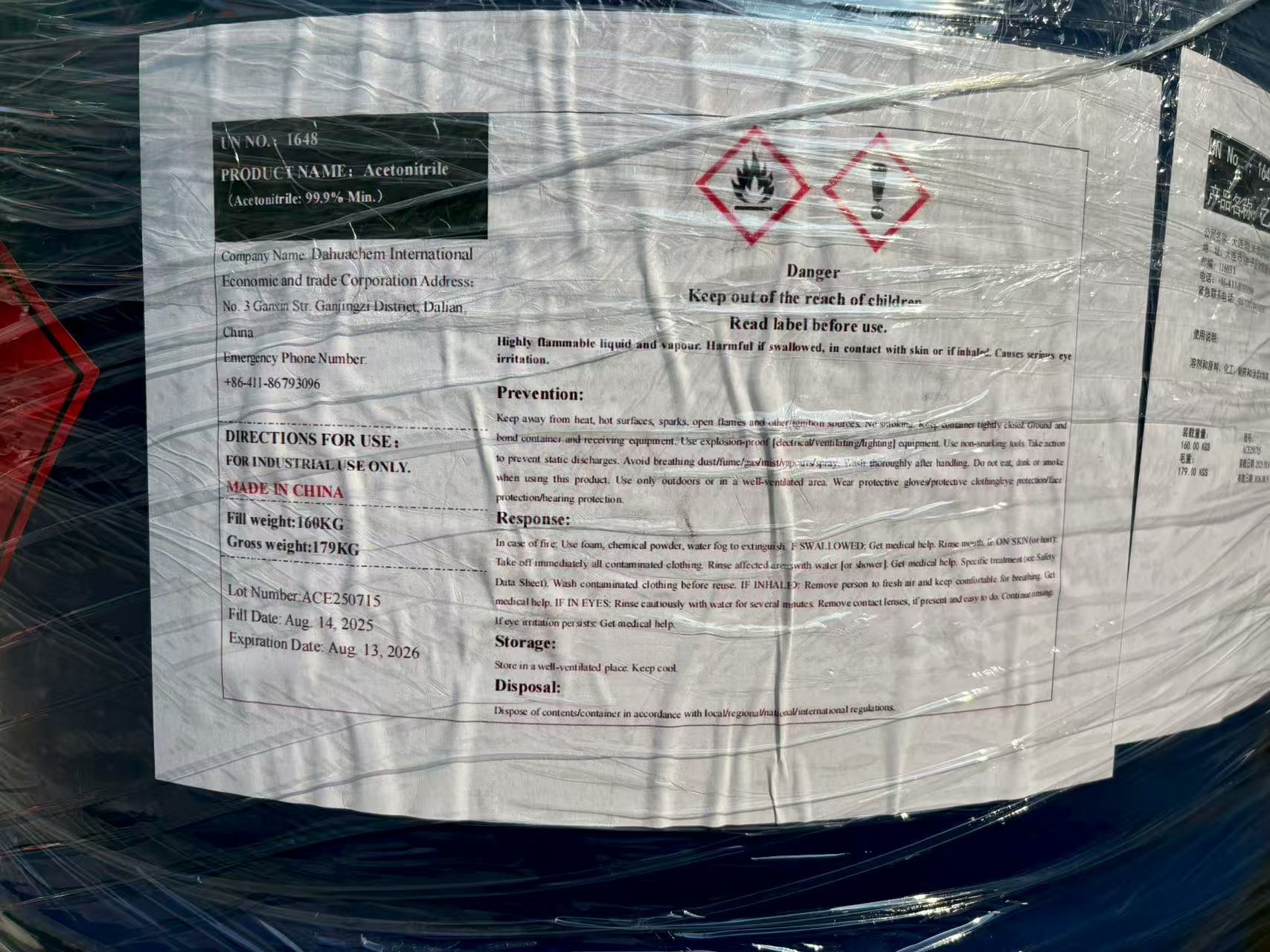 Product Name: ACETONITRILE CAS NO.: 75-05-8 Molecular formula: C2H3N Molecular weight: 41.05